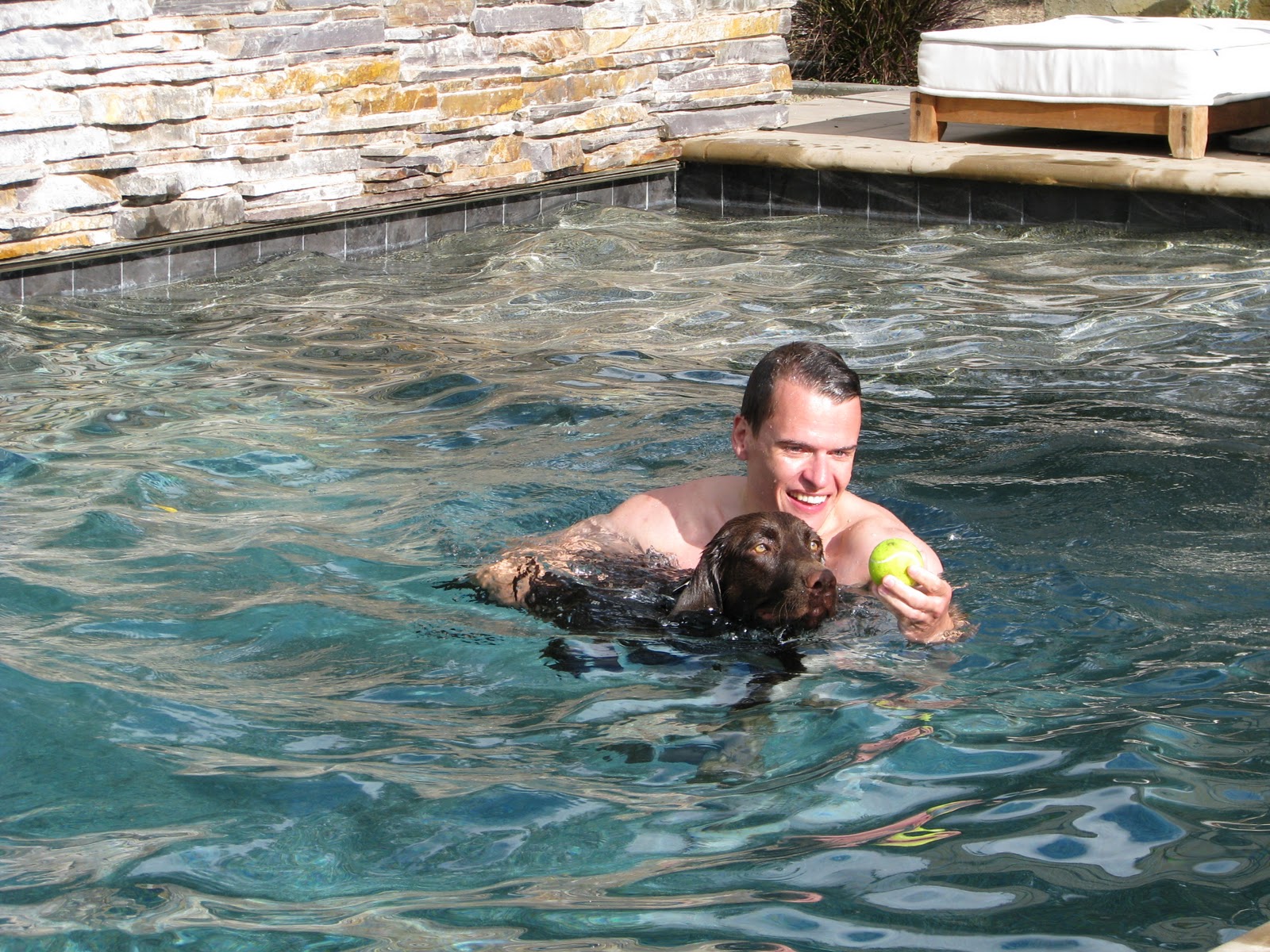 Next we had swimming races and as you can see, I was much faster than daddy. So he tried to cheat by distracting me with tennis balls. Bad daddy!
