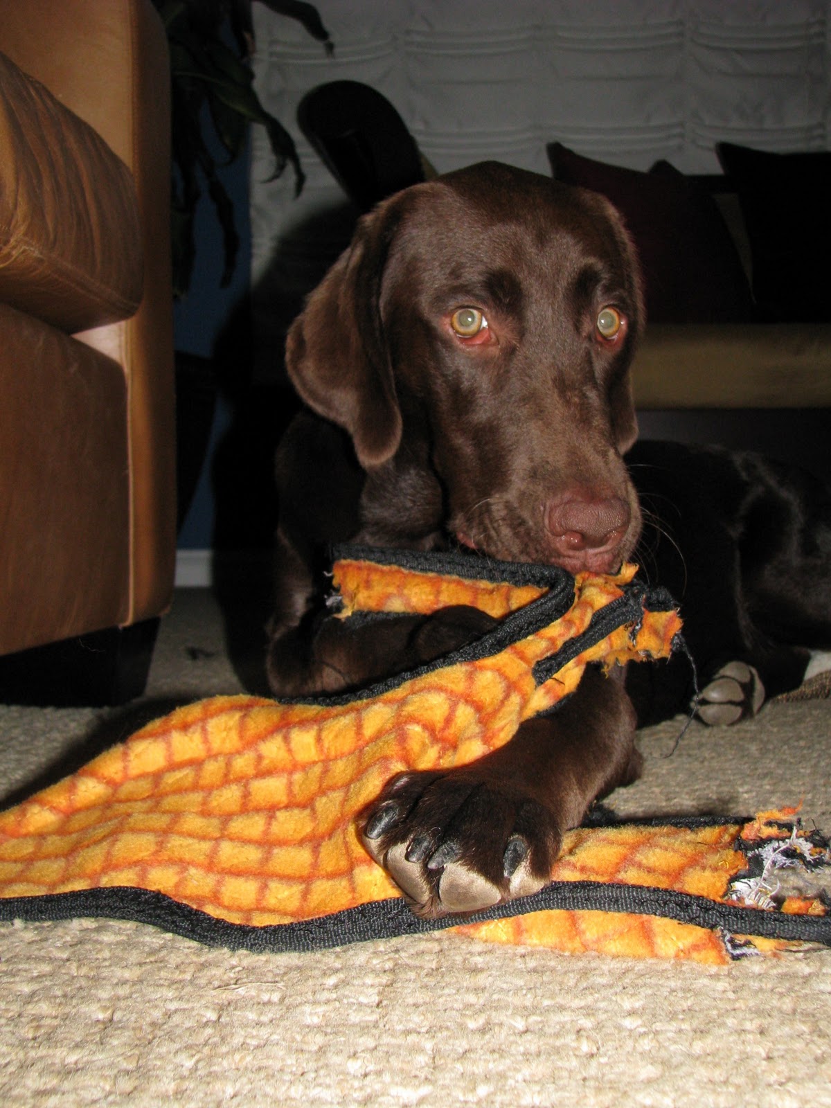 Mummy and Daddy have been busy with something called the “global economic recession”… people are being forced out of their kennels and have to buy a smaller place to live. I am glad I already have a kennel and a big dog bed because if I had to have a smaller one I would have trouble fitting on it at night, especially as I like to stretch out and make myself really long when I sleep. Apparently people also have to make do with less. So in order to do my part, I am playing with toys like this one, which should really be thrown away as I have chewed them a lot.