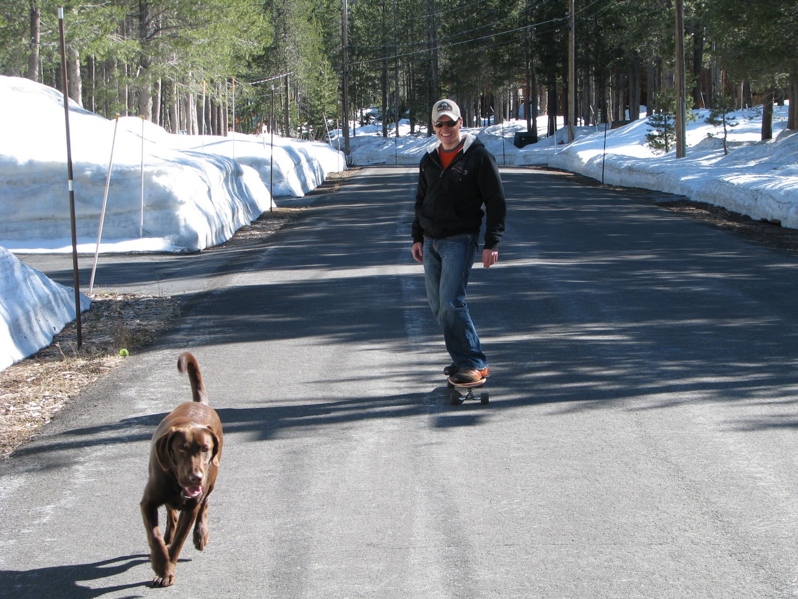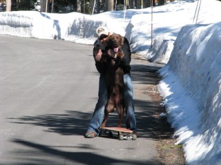 We went up to the cabin this weekend for the last few days of Spring skiing. As the weather was so lovely, daddy decided to put the snowboard to one side and bring out another board – his skateboard! I have never seen this before but what a wheeze! Daddy rolled all along the roads by the cabin and I followed along, sometimes leading the way and other times chasing daddy.
