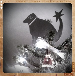 I love Christmas!! It’s always so exciting because there are lots of new toys, lots of food and I get to spend a lot of time at home with mummy and daddy. This year I got to spend extra time with daddy as he was off work for a while before Christmas. His doctor fixed his elbow as it had been hurting him for a year. I just recently found out that I have a possible tear in my back knee and very early stage arthritis in my hips, so daddy and I can hang out on the TV rug together and get well again.In preparation for Christmas, mummy put up a Christmas tree. It looked beautiful – all sparkly lights and baubles. It sits on top of the counter so I can’t accidentally knock it over or get my tail caught in it. Instead of putting a fairy on top of our tree, we had a silver silhouette of me with a star on my tail! I think I look much better up there than the fairy, although some of my two-legged friends seemed to think I was doing something naughty on top of the tree!