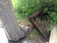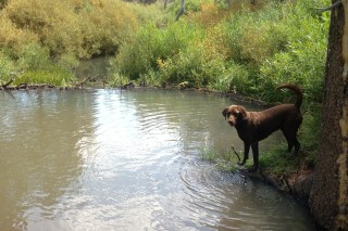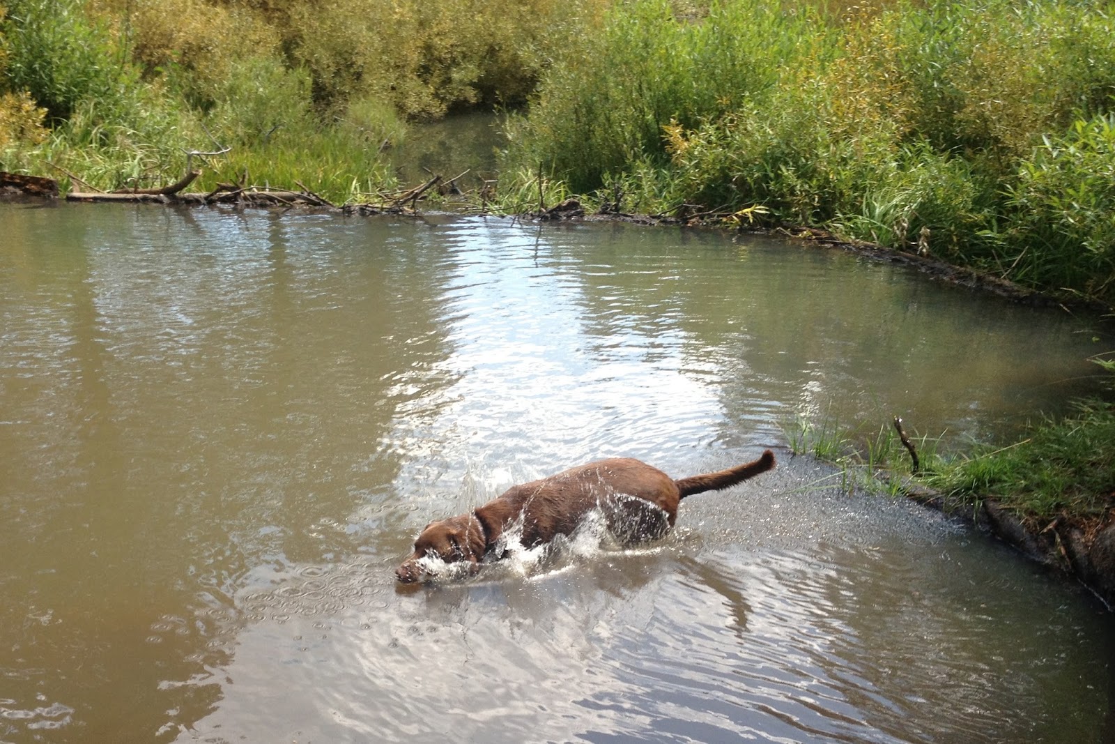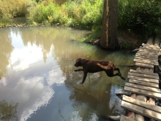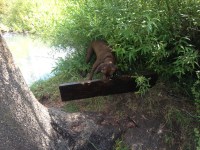 Mummy went for a long bike ride today as she is training for a big ride. While she was gone, daddy took me for a walk along Alder Creek and we found a great swimming hole. Well I did. I stood on the side to encourage daddy to join me but he was not interested. He said something about bugs and mud….