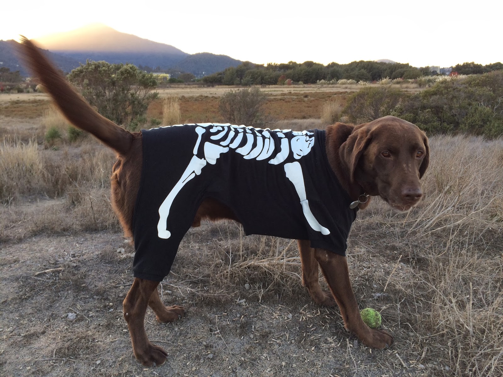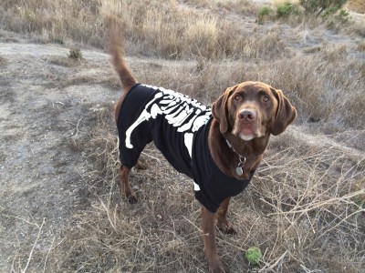 I made a lot of people smile today with my canine skeleton costume. I wore it while shopping and then playing at the marshes. It didn’t stop me chasing tennis balls but I definitely wasn’t allowed to go swimming in the bay in it! |