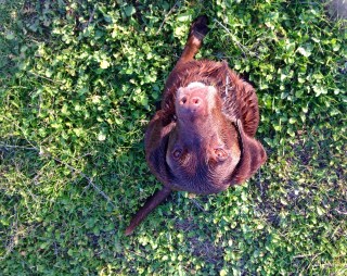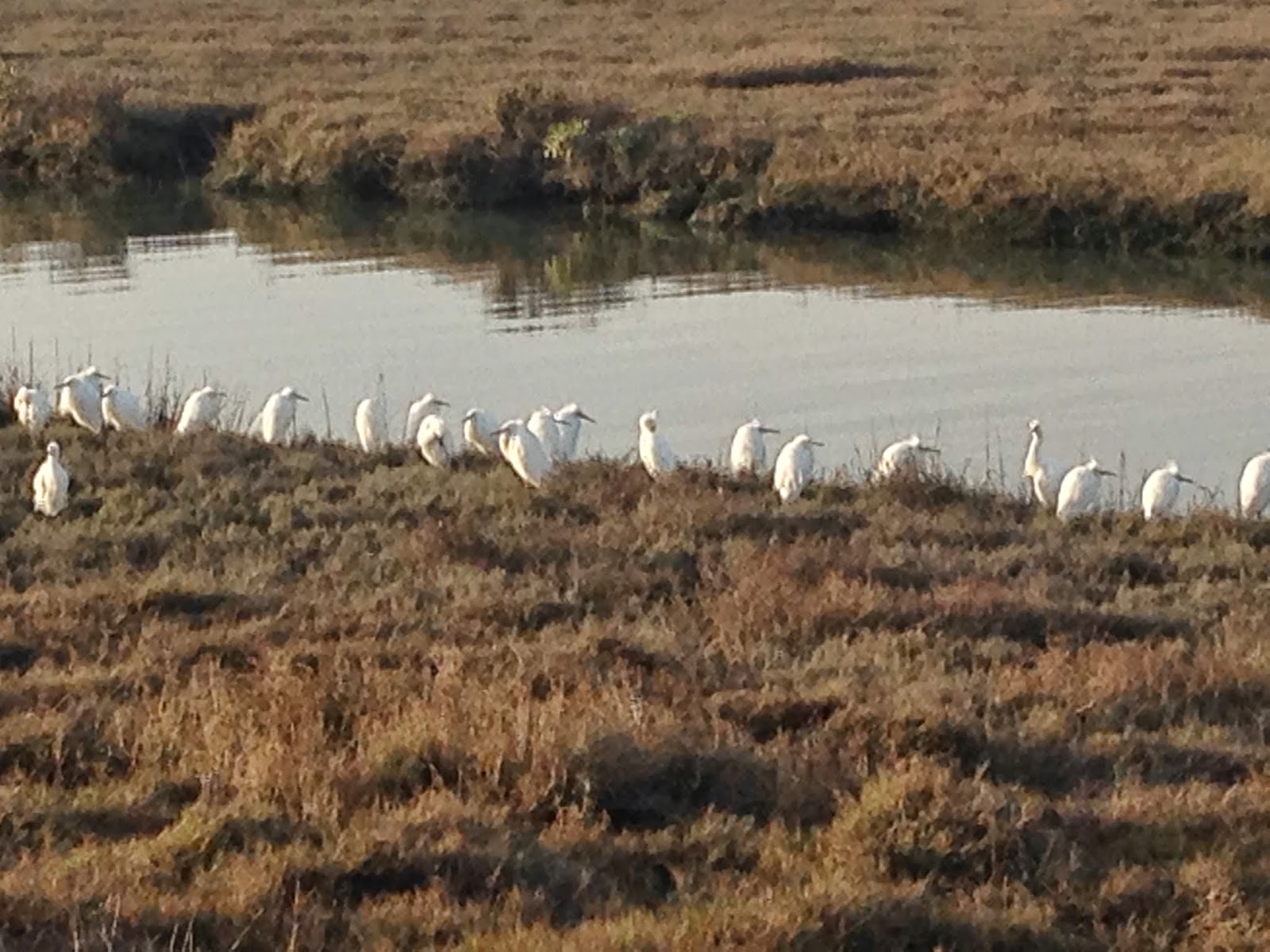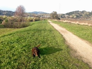 The winter rains have filled up the central grassy area and made a beautiful lake. It’s surrounded by white birds who seem happy to watch me play. There’s no end to the fun a dog can have squashing his tennis ball into the muddy wetland grass!