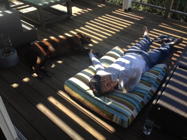 The good news is that I have to have soft food so my kibble comes covered in gravy…oh, and I get lots of attention and naps on the deck with daddy, who seems to think my bed is his!