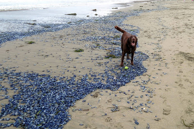 Daddy’s parents are here and we all went to spend a few days at Bodega Bay. When we went to the beach, it was covered in beautiful blue jelly fish called Velellas. I loved them! I thought they were so beautiful and I kept barking it to mummy and daddy over and over again….