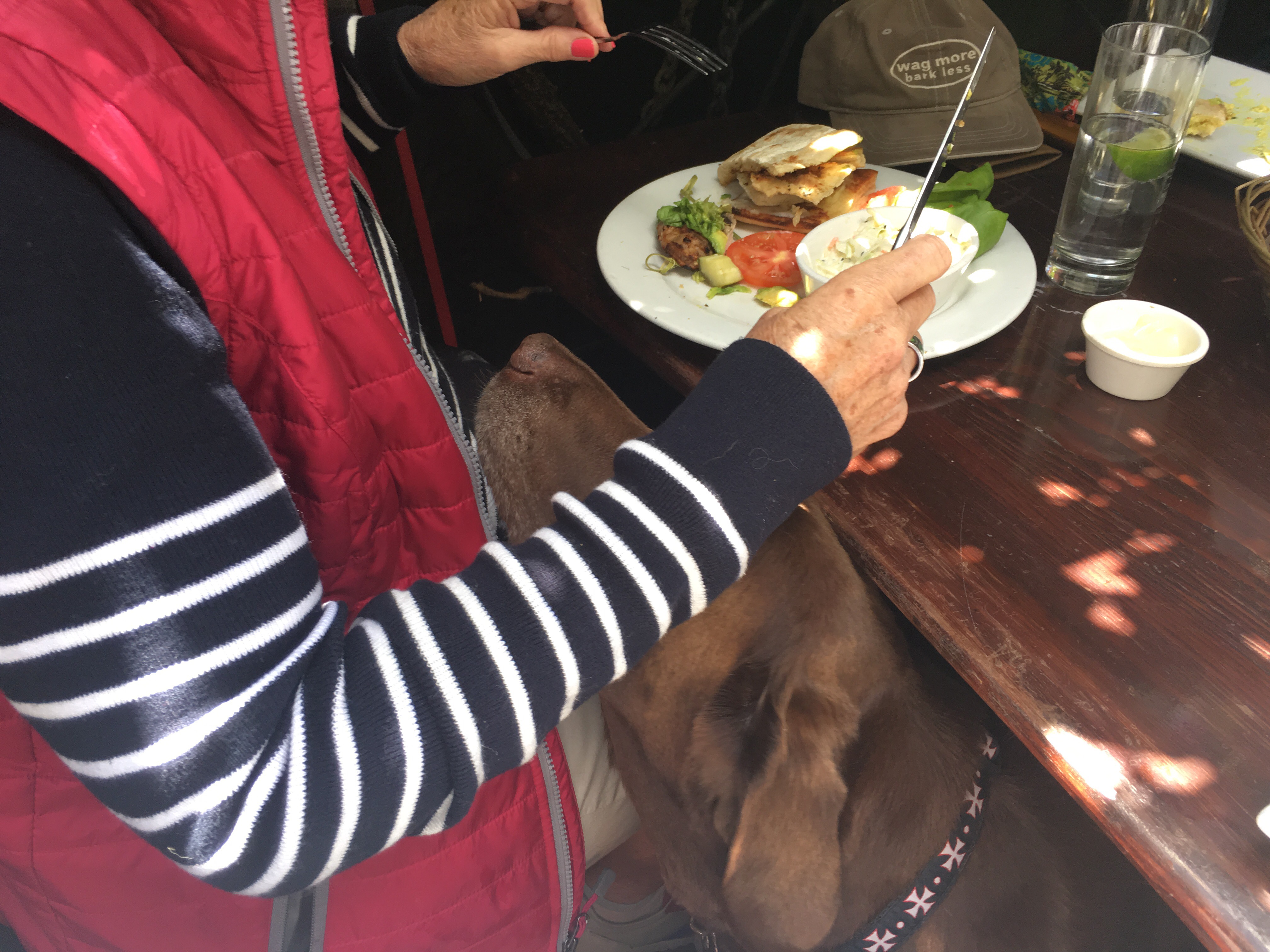 The restaurant also had a menu for humans. Aunty Carol ordered something that smelled really tasty. I really wanted to know what it was. I wanted even more to be able to eat it so I gave her my best cute look.